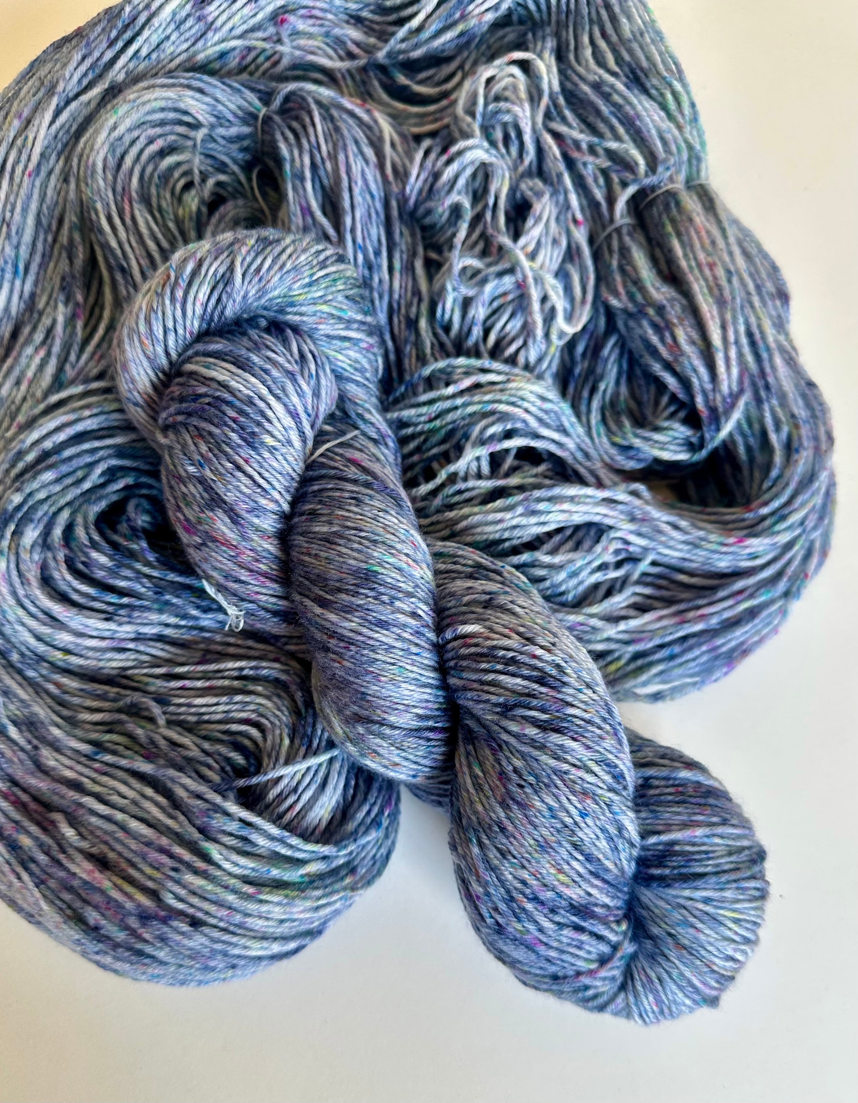 甘撚りのため編み地の幅が広く、ソックス向け(2mm前後)からショール向け(3〜4mm前後)まで、幅広い号数で編むことができます。小さな針で編めば細く、大きめの針で編めばふんわりと仕上がります。1カセで大人用の靴下が1足編める量です。お洗濯の場合はネットを使用し、平干しして乾かしてください。製造の都合上、結び目が発生する場合がございますのでご了承ください。