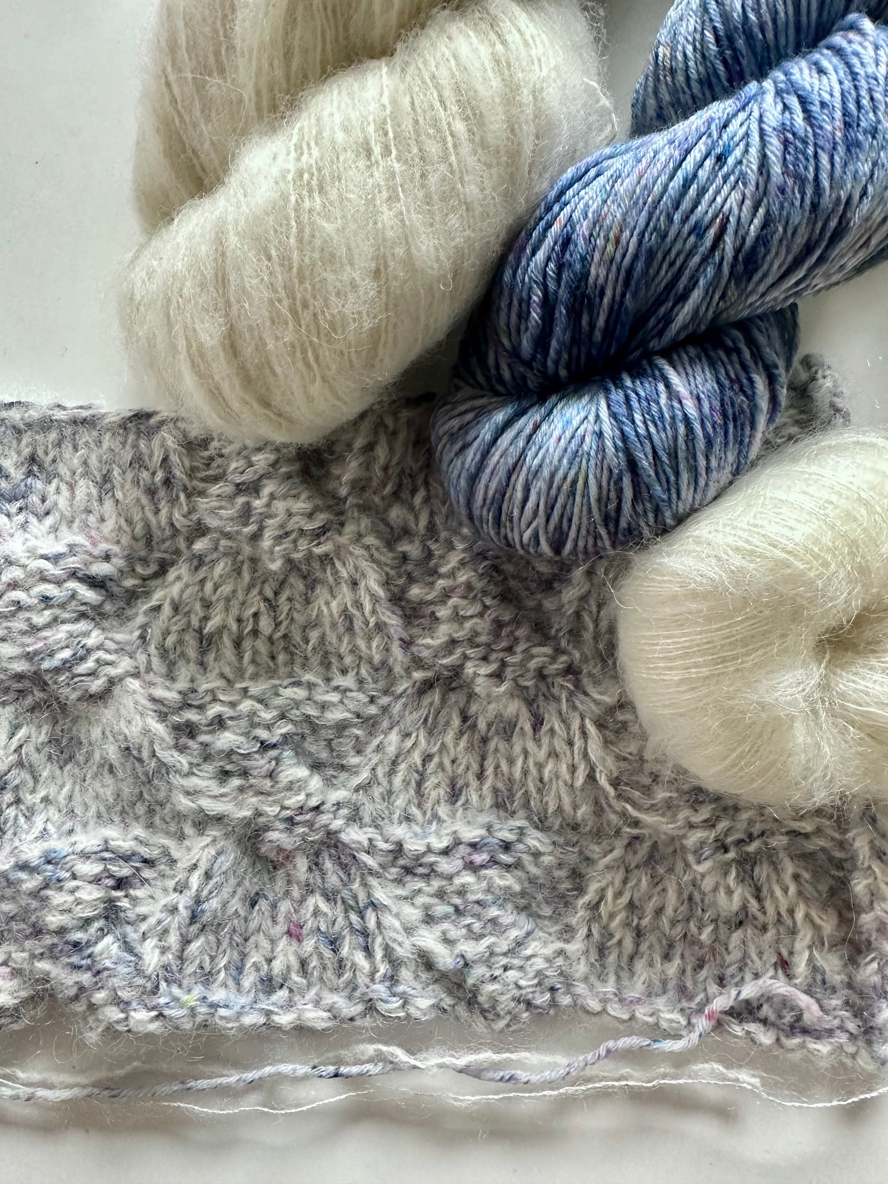 無染色Margo kid mohair silk lase、無染色Margo Fluffの3本どりで針はUS 10 です。