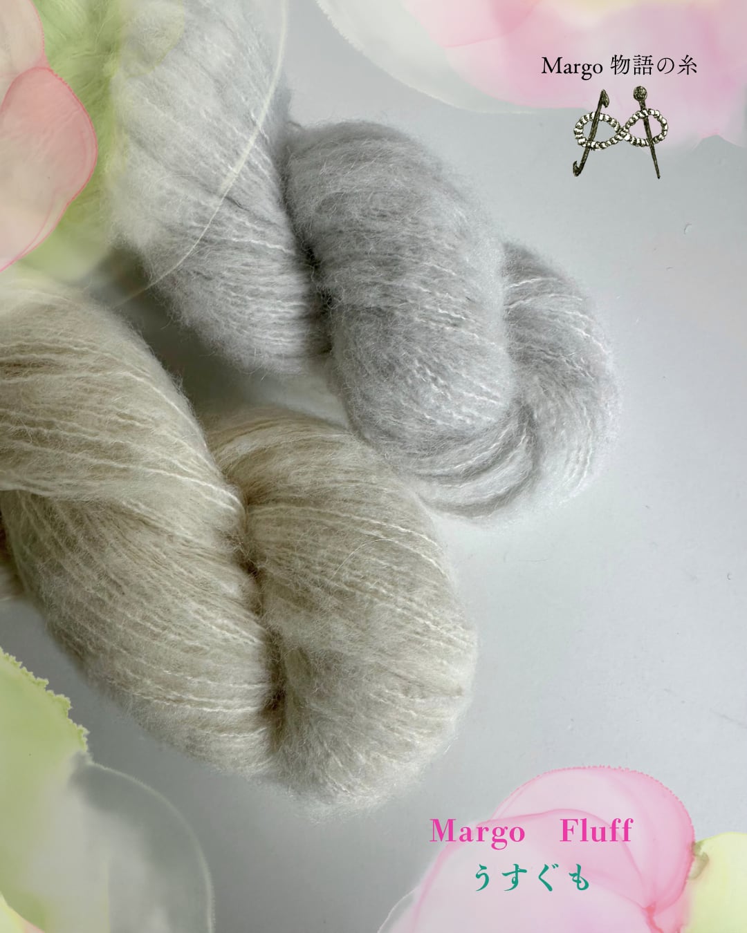 Margo lace「藤浪」、無染色Margo Fluff ナチュラル の3本どりで